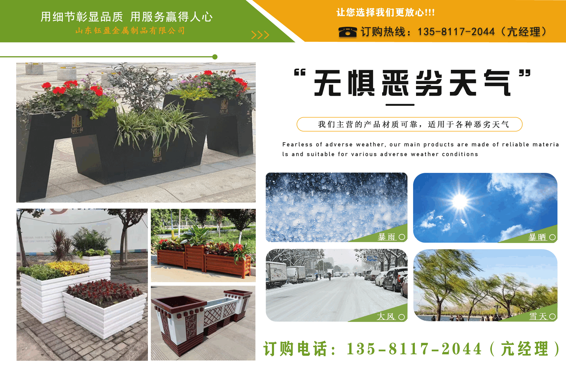 山東鈺盈金屬制品有限公司主營鍍鋅板花箱,道路隔斷花箱,定制花箱,戶外道路花箱,花箱座椅等產品,產品結構合理、性能優良,具有強度高、耐腐蝕、抗老化、隔熱隔音、節約能源、外形美觀、使用壽命長等優點,深受國內外客戶認可。  我們根據客戶所在城市的文化特征,制造出符合當地城市文化氣息的自然立體、觀賞性強的花箱產品成為城市里一道靚麗的風景線。  公司實行誠實、公正、守信、價格合理、平等互利。  公司憑借雄厚經驗實力,恪守誠信為本的原則,得到了眾多客戶的信賴,并在業界獲得良好的口碑。建立了穩固的合作關系,隨著業務的不斷發展和壯大,合作伙伴的范圍也在不斷擴大。我們熱情盼望與您的合作,為社會的可持續發展獻上一份努力。...